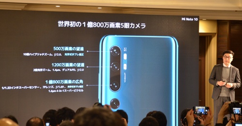 日本市場への参入第1弾として発表したスマホが「Mi Note 10」だ。最大の特徴が背面に5個のカメラを搭載すること。1億800万画素のカメラを筆頭に、デジタル50倍ズームが可能な500万画素カメラ、超広角の2000万画素カメラなどを備える。被写体に応じてカメラを使い分けることで、撮影にこだわるユーザーの獲得を狙う。「スマホ撮影は新時代に入る」と東アジア地域のゼネラルマネージャーを務めるスティーブン・ワン氏は語る。