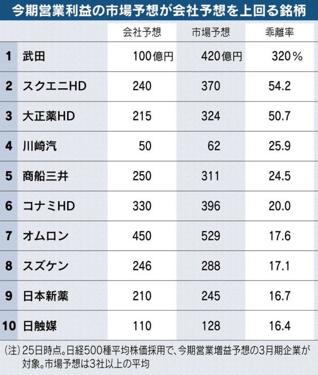 市場の業績予想が高い銘柄 1位武田、医療やゲーム上位 - 日本経済新聞