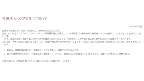 日本郵便は10月31日までの熱中症対策として、乗車中や屋外での配達中などに適宜マスクを外す方針であると発表した。また、水分補給などのさいにも周囲との距離を十分に確保した上で、マスクを外して休憩を取るという。