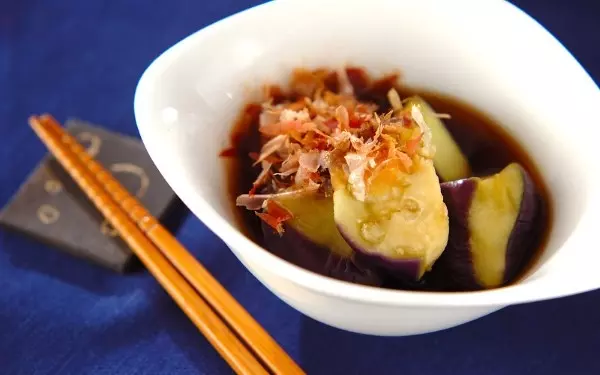 ナスをレンジでチンして浸すだけ! かつお節のほか、ショウガやネギなどの薬味を加えれば、そうめんと一緒にさっぱりといただけますよ。夏の常備菜にもってこいです。